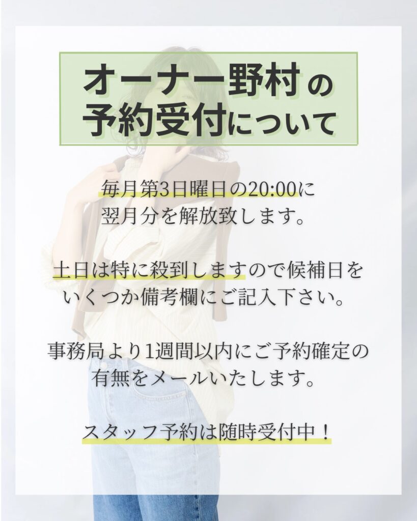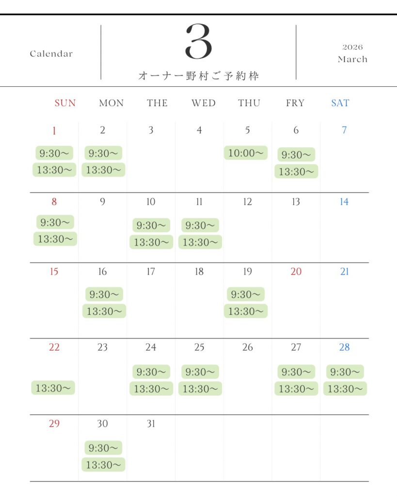 【3月のご予約・オーナー野村枠】は2/15(日)20:00から受付スタート⏰「ホットペッパービューティー」から✨